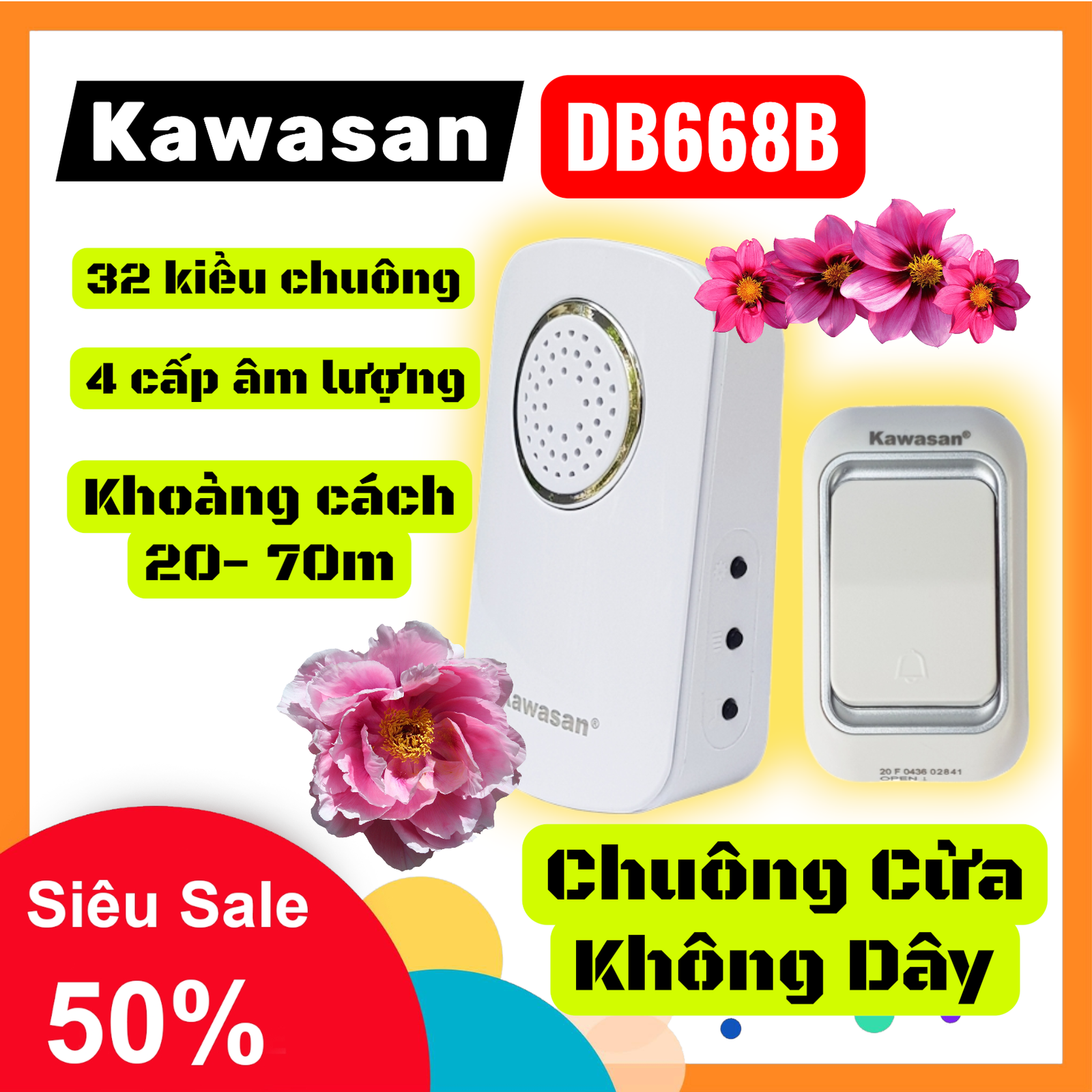 Chuông cửa không dây DB668B là thiết bị báo hiệu hiện đại giúp thông báo khi có khách đến mà không cần đi dây phức tạp. Sản phẩm hoạt động dựa trên sóng RF 433MHz, cho phép truyền tín hiệu ổn định xuyên tường và khoảng cách xa.